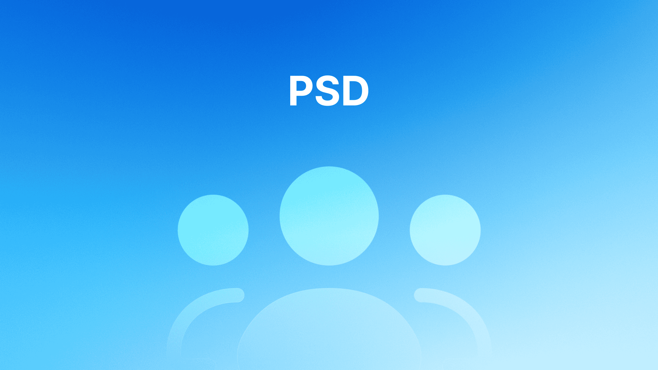 Baltas tekstas "Kaip sumokėti PSD?" mėlyname gradiento fone su trimis abstrakčiomis apskritomis figūromis, primenančiomis žmonių piktogramas.